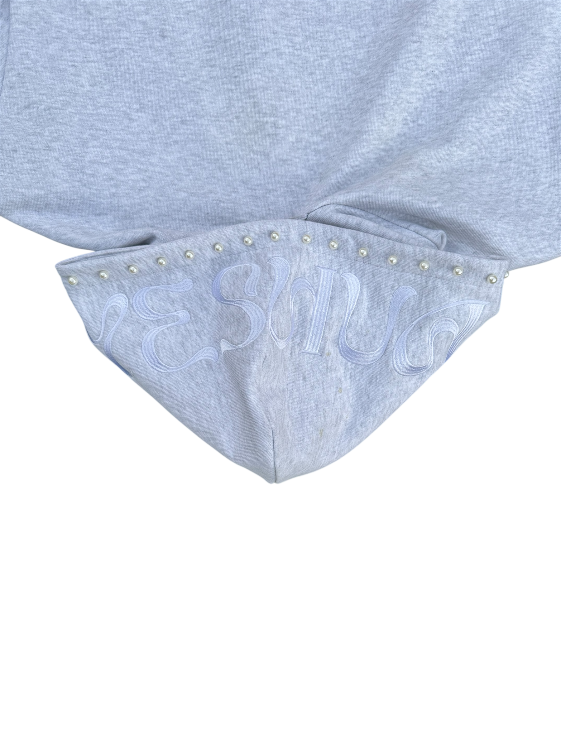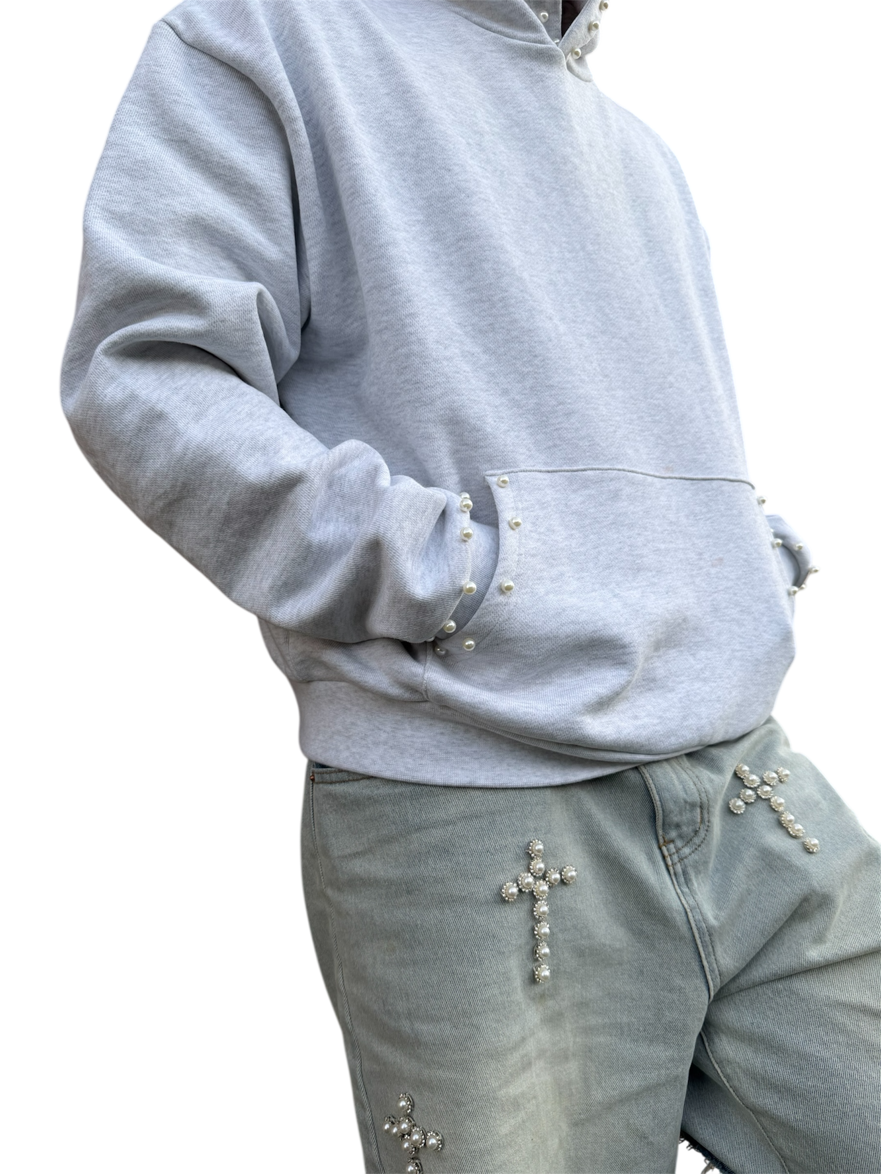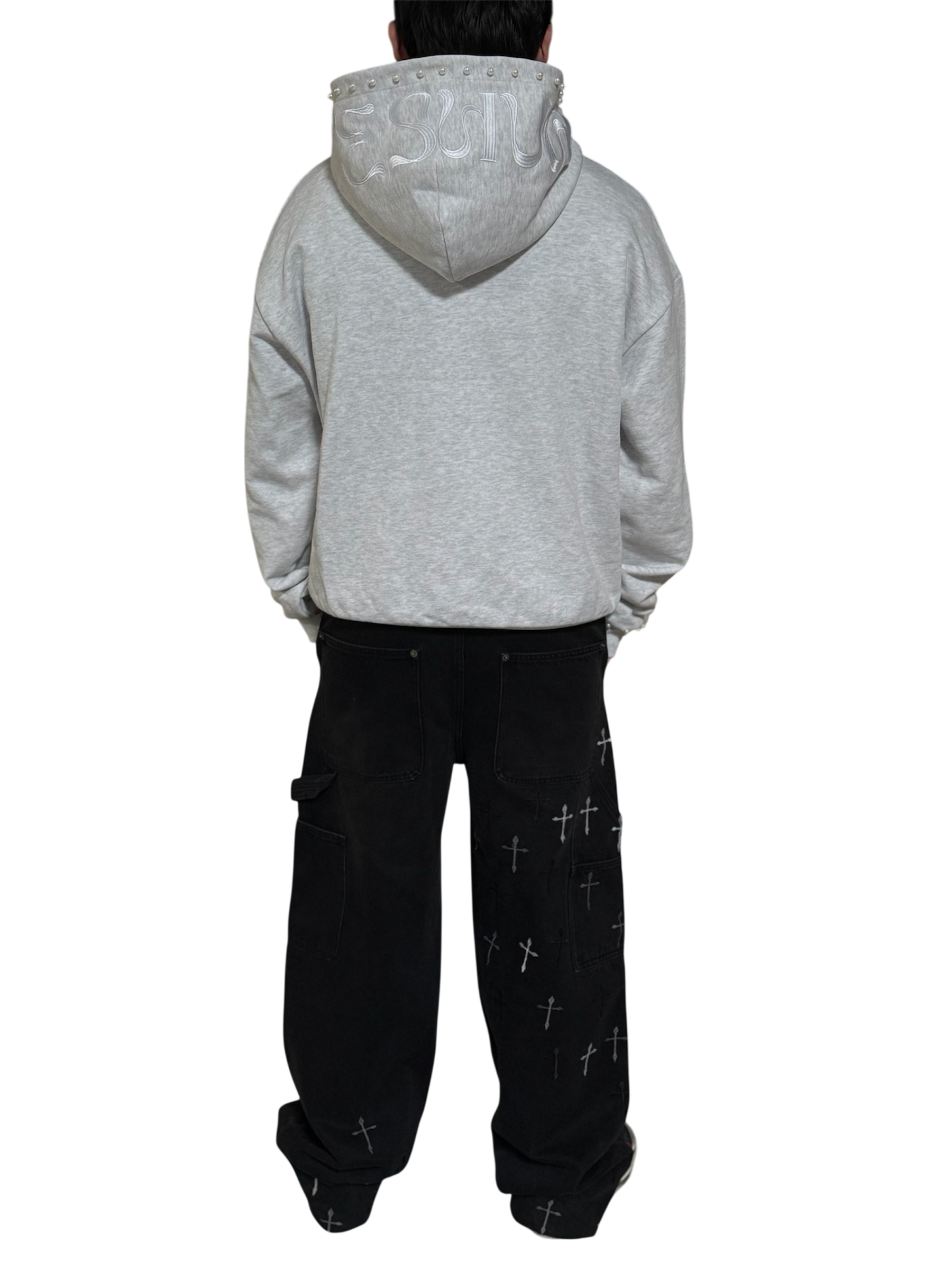 Heavyweight grey hoodie with Pearl details on the cuffs, hood, and front pocket giving it a premium touch,Yeshua embroidery along the hood — meaning Jesus in Hebrew.